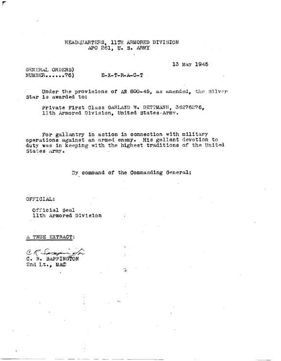 CITATION For gallantry in action in connection with military operations against an armed enemy. On 5 April 1945, in the vicinity of MEININGEN, GERMANY, while serving as a member of the Reconnaissance Platoon, Private DETTMANN was making a reconnaissance of the area in front of advancing tank elements. Private DETTMANN and members of the Reconnaissance Platoon were successful in destroying two and capturing seven enemy panzerfaust teams thus enabling the tank elements to proceed. While entering MEININGEN, GERMANY, the Reconnaissance Platoon came under heavy small arms fire. While most of the platoon took cover Private DETTMANN stayed in his vehicle, gave valuable information over his radio to advancing tanks, and manned the machine gun until he was seriously wounded by an enemy sniper. His gallant devotion to duty was in keeping with the highest traditions of the United States Army. Private DETTMANN entered the military service from Wisconsin.