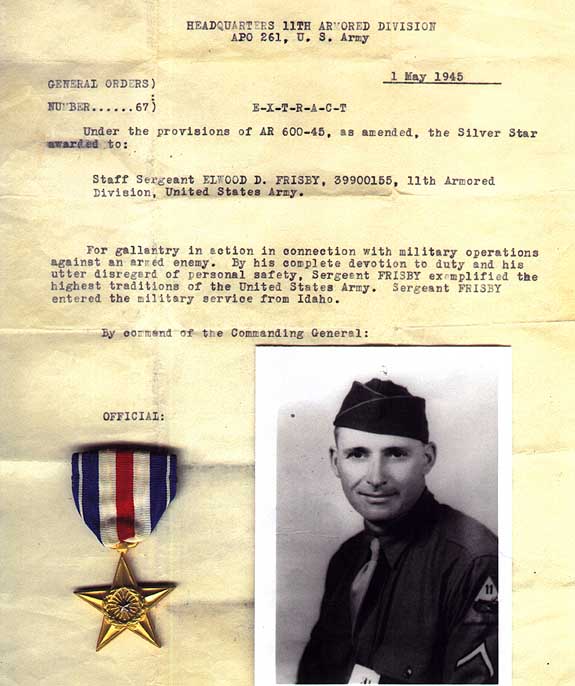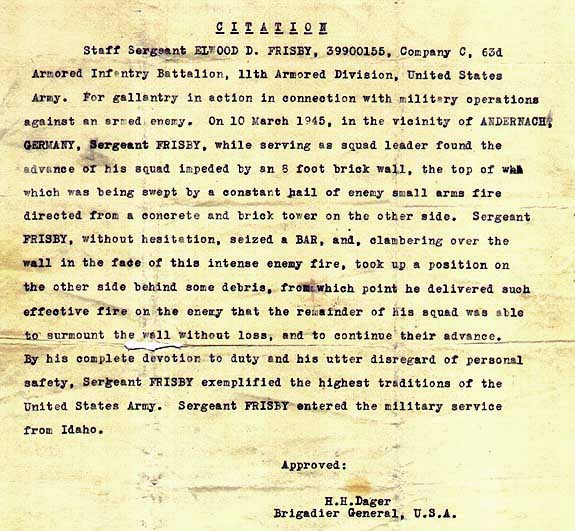 FRISBY, ELWOOD D. Rank and organization: Staff Sergeant, 11th Armored Division, United States Army. General Order No. 67, 1 May 1945. Citation: For gallantry in action in connection with military operations against an armed enemy. By his complete devotion to duty and his utter disregard of personal safety, Sergeant FRISBY exemplified the highest traditions of the United States Army. Sergeant FRISBY entered the military service from Idaho.