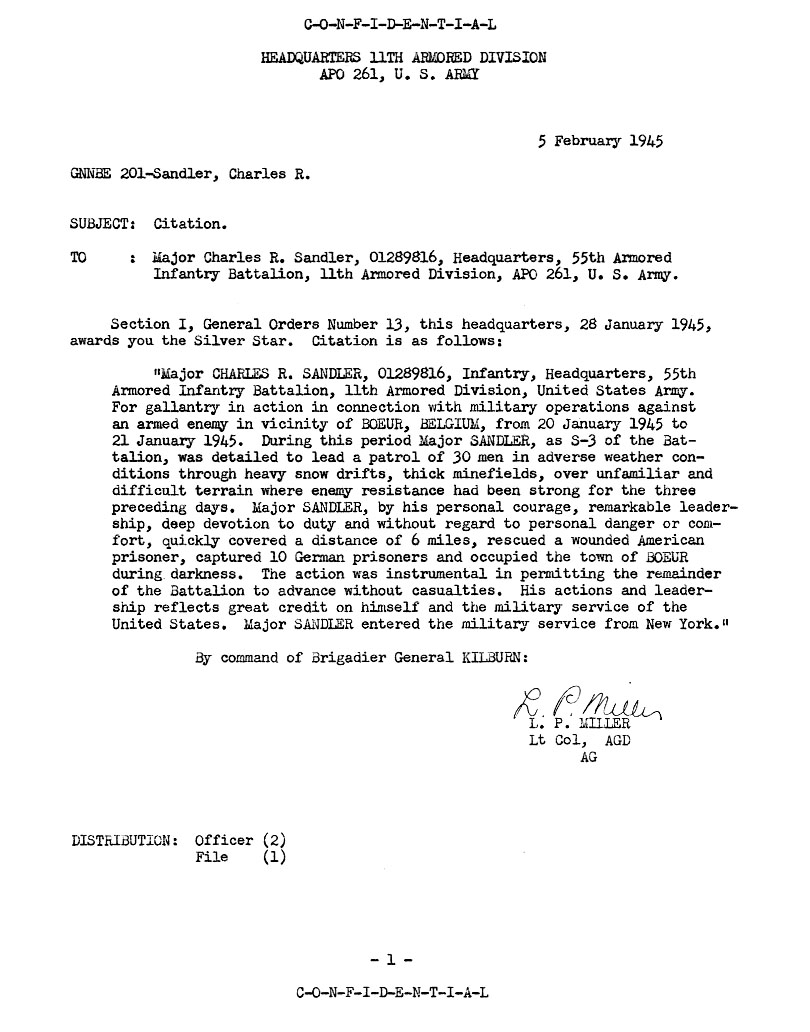 SANDLER, CHARLES R. Rank and organization: Major, 01289816, Headquarters, 55th Armored Infantry Battalion, 11th Armored Division, APO 261, U. S. Army. General Order No. 13, 28 January 1945. Citation: Major CHARLES R. SANDLER, 01289816, Infantry, Headquarters, 55th Armored Infantry Battalion, 11th Armored Division, United States Army. For gallantry in action in connection with military operations against an armed enemy in vicinity of BOEUR, BELGIUM, from 20 January 1945 to 21 January 1945. During this period Major SANDLER, as S-3 of the Battalion, was detailed to lead a patrol of 30 men in adverse weather conditions through heavy snow drifts, thick minefields, over unfamiliar and difficult terrain where enemy resistance had been strong for the three preceding days. Major SANDLER, by his personal courage, remarkable leadership, deep devotion to duty and without regard to personal danger or comfort, quickly covered a distance of 6 miles, rescued a wounded American prisoner captured 10 German prisoners and occupied the town of BOEUR during darkness. The action was instrumental in permitting the remainder of the Battalion to advance without casualties. His actions and leadership reflects great credit on himself and the military service of the United States. Major SANDLER entered the military service from New York. By command of Brigadier General KILBURN |